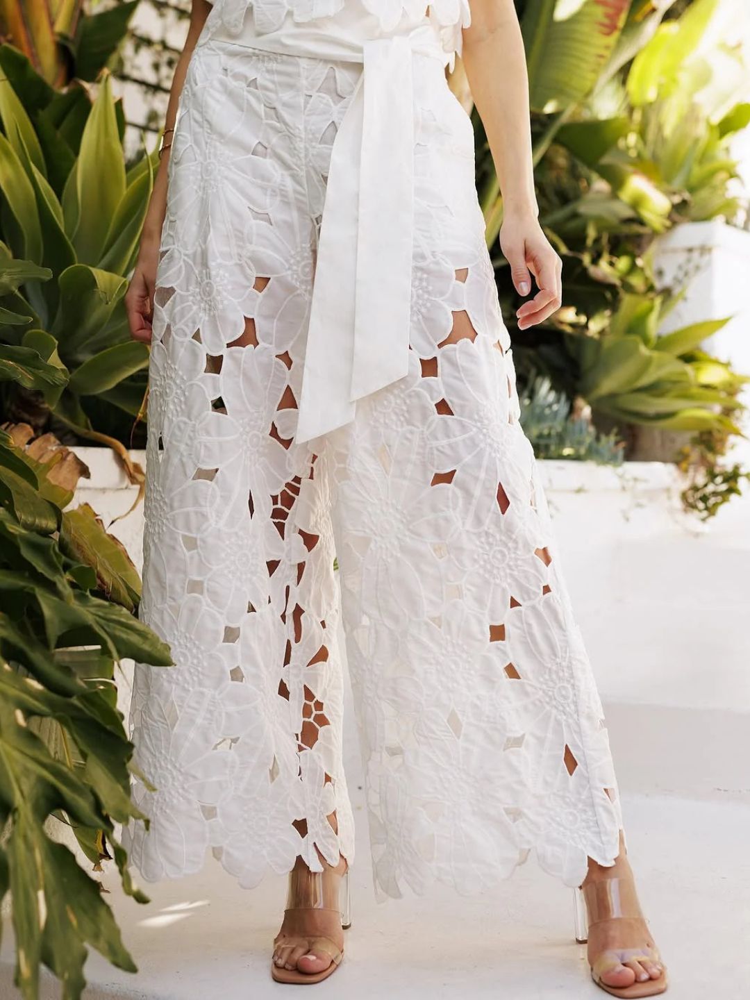 Il completo è composto da una camicia a mezza manica con colletto classico, impreziosita da ricami in pizzo guipure e bottoni frontali. I pantaloni a palazzo, leggeri e ariosi, presentano uno shorts interno in fresco cotone per garantire copertura, mentre il pizzo traforato lascia intravedere la pelle con eleganza, donando un effetto fresco e sensuale.